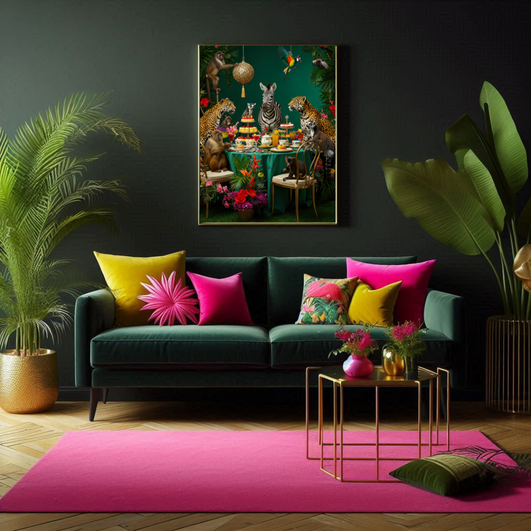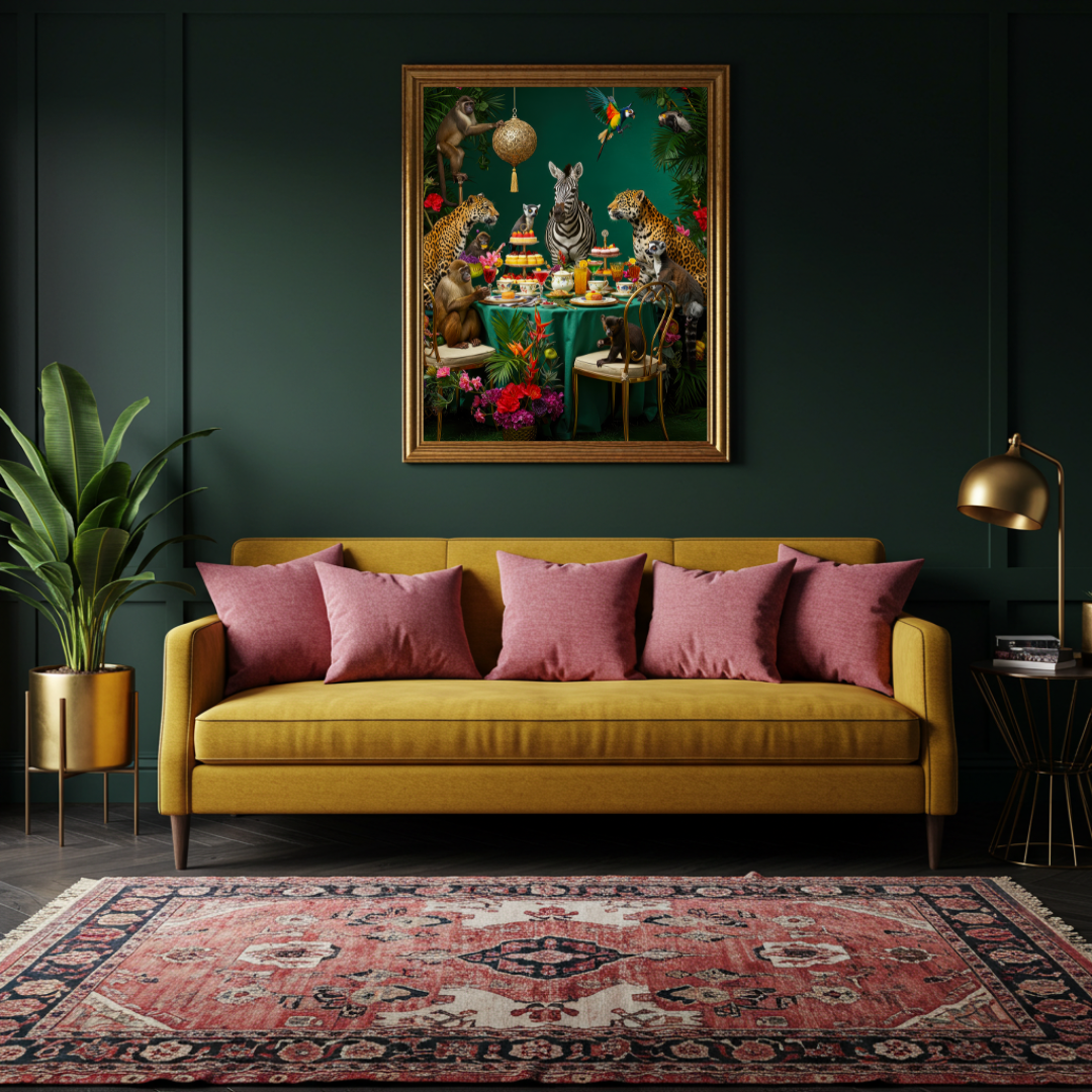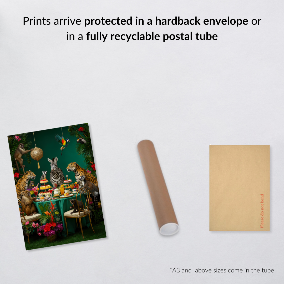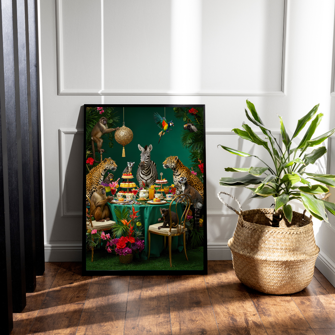 The Jungle Soirée print captures an extravagant tea party hosted by a zebra and attended by a vibrant cast of animal guests—from cheeky monkeys to elegant cheetahs, lemurs, parrots, and more. Set against a deep emerald backdrop, this lush, maximalist artwork bursts with florals, disco sparkle, and personality. Perfect for the bold at heart who love statement pieces and a dash of humour in their decor.