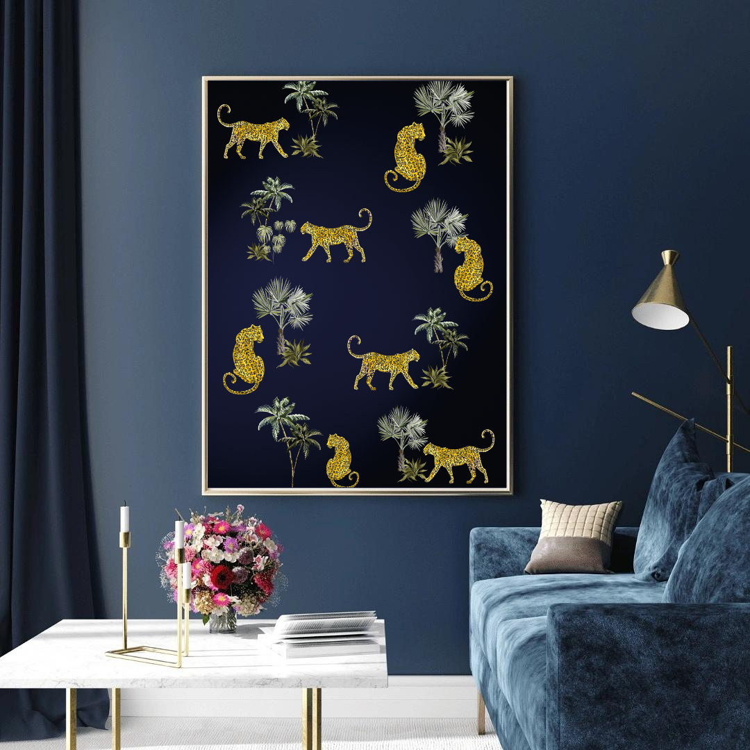 This Leopards on Dark Blue Print is the perfect balance of wild beauty and refined luxury. Golden leopards prowl gracefully among soft botanical palms, all set against a deep midnight blue background, creating an aesthetic that is both bold and effortlessly chic. Whether styled in a modern glam, eclectic, or maximalist space, this print is an instant conversation starter.