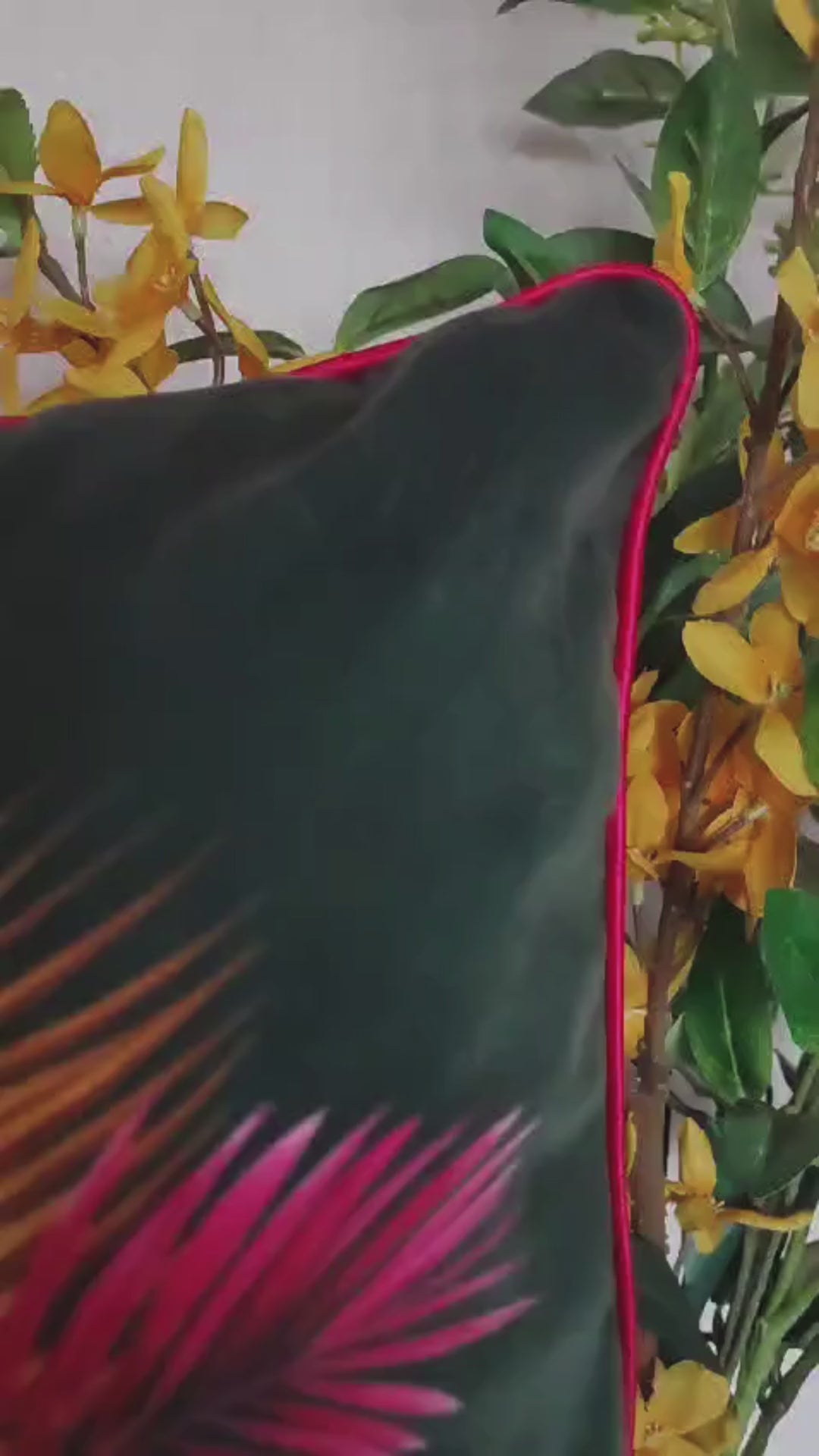 Transform your space with a touch of wild luxury. The Luxe Leopard Cushion is a bold, high-end statement piece, crafted to bring exotic opulence into your home. Featuring a striking leopard poised on lush fuchsia jungle leaves, set against a deep emerald green backdrop, this design embodies power, elegance, and unapologetic vibrance. Finished with hot pink piping for an extra touch of maximalist glamour, this cushion is designed to turn heads.