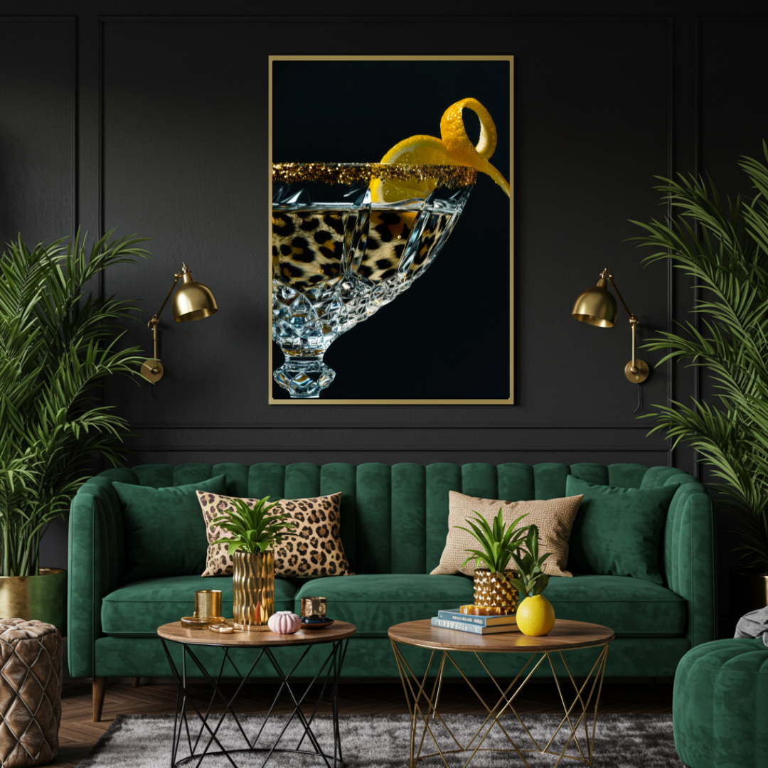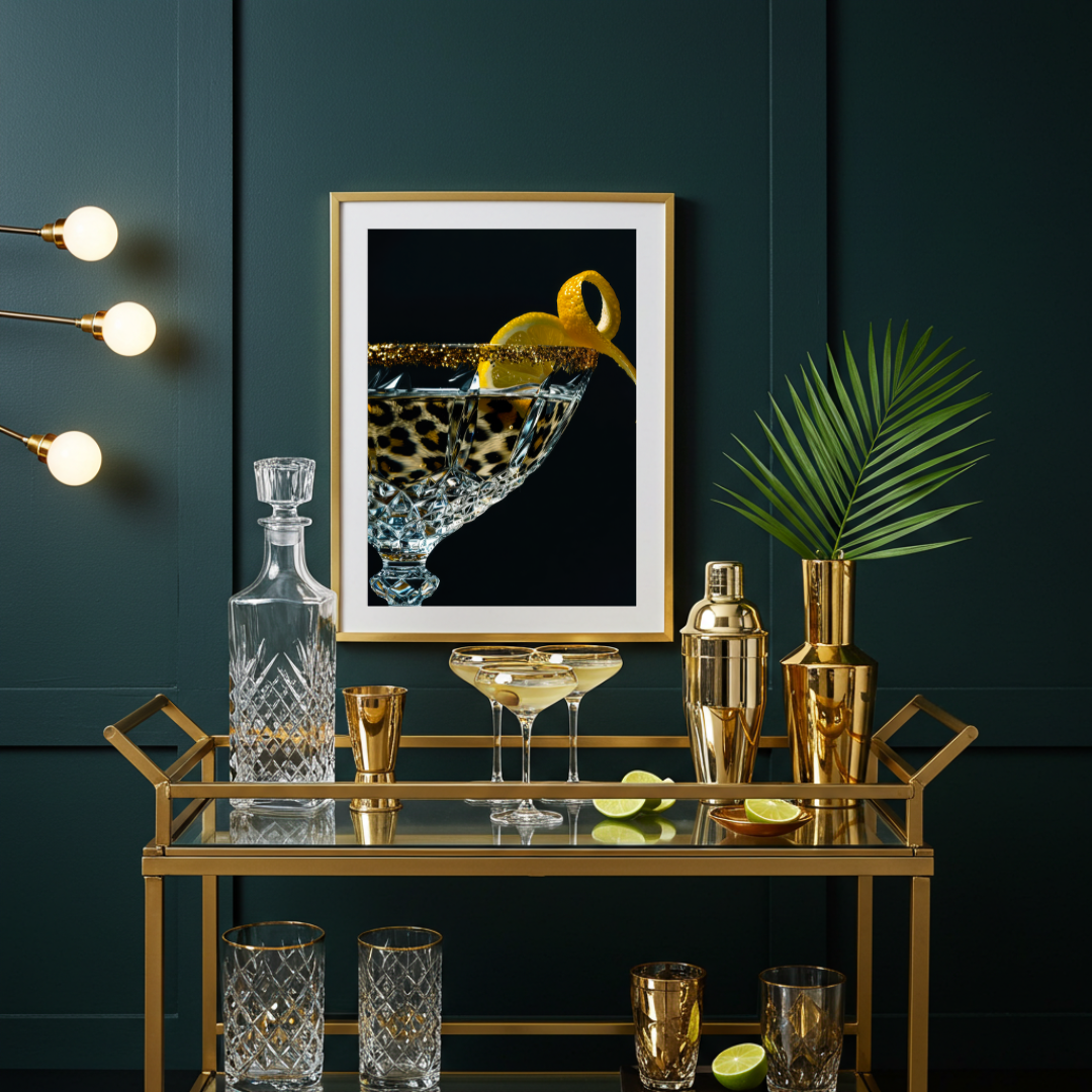 Frame in a gold or black frame to match the golden sugar rim and moody backdrop. Style near a cocktail trolley, mirrored shelf, or luxe kitchen area for the perfect party-ready accent.