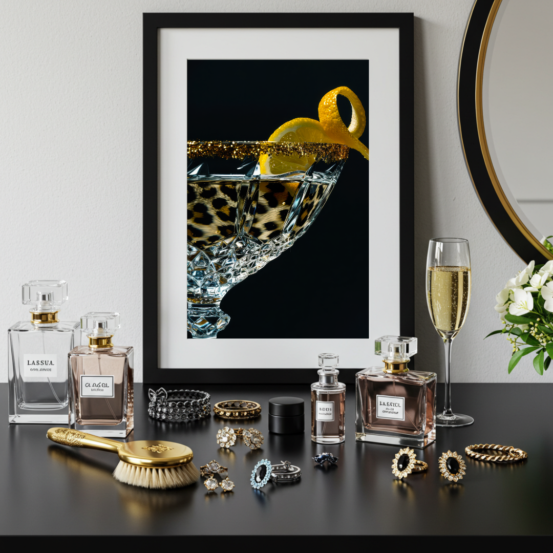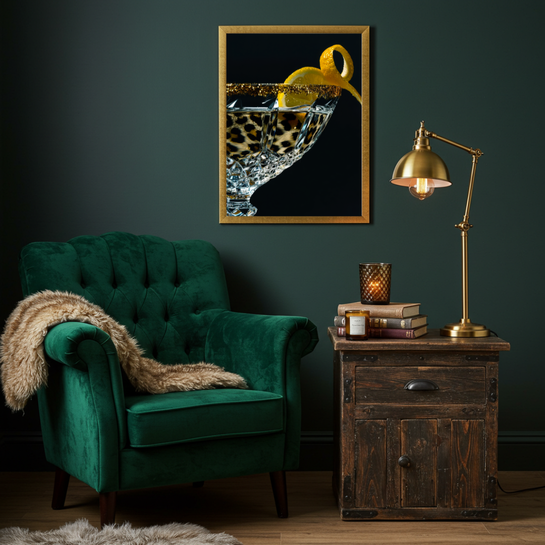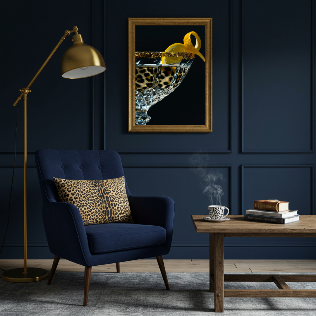 The Leopard Print Martini Twist is a glamour-packed artwork that blends classic cocktail elegance with fierce fashion energy. Featuring a crystal coupe with leopard-printed liquid, a sugared rim, and a bold lemon twist – it’s a cocktail of pure aesthetic indulgence.