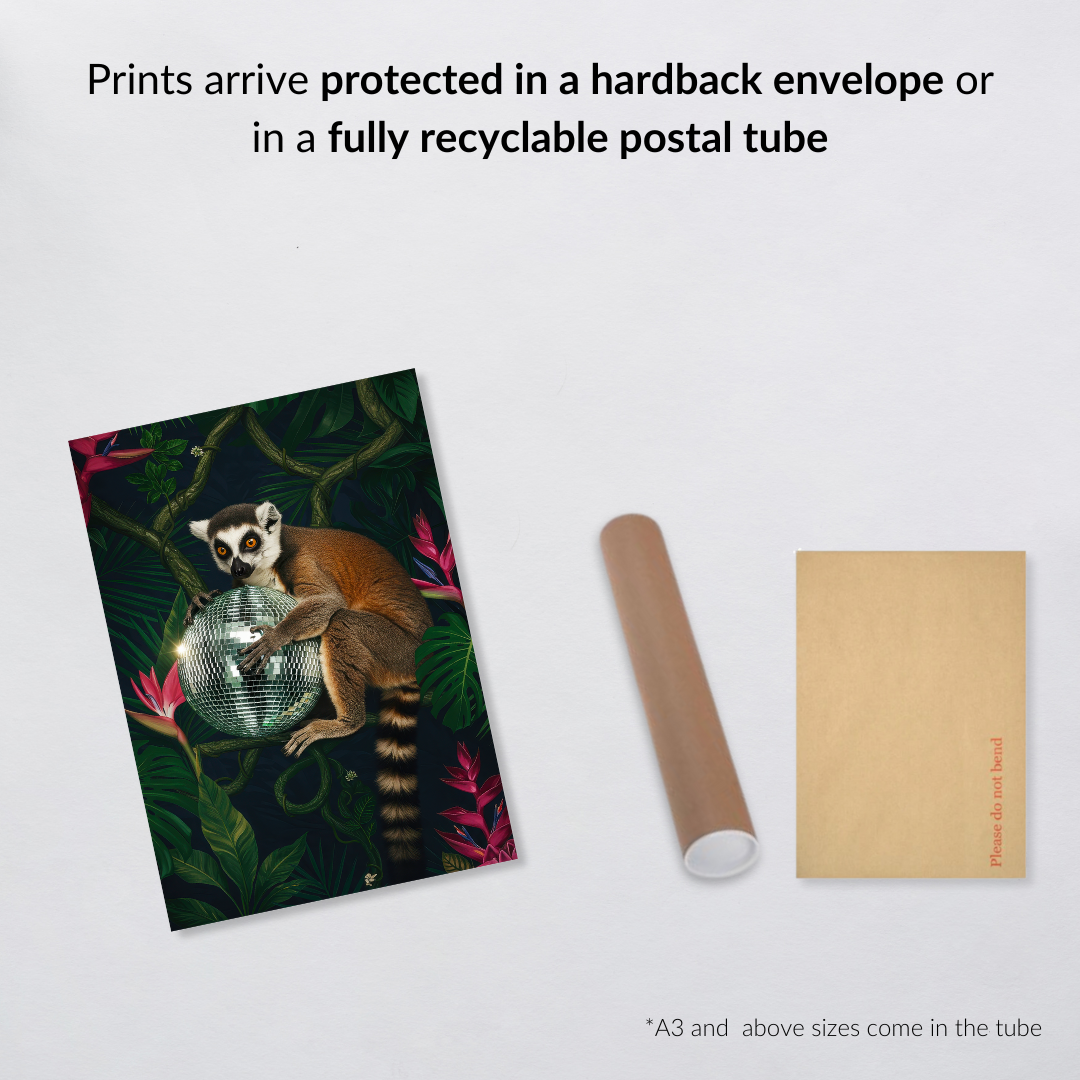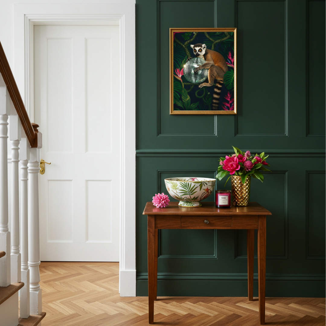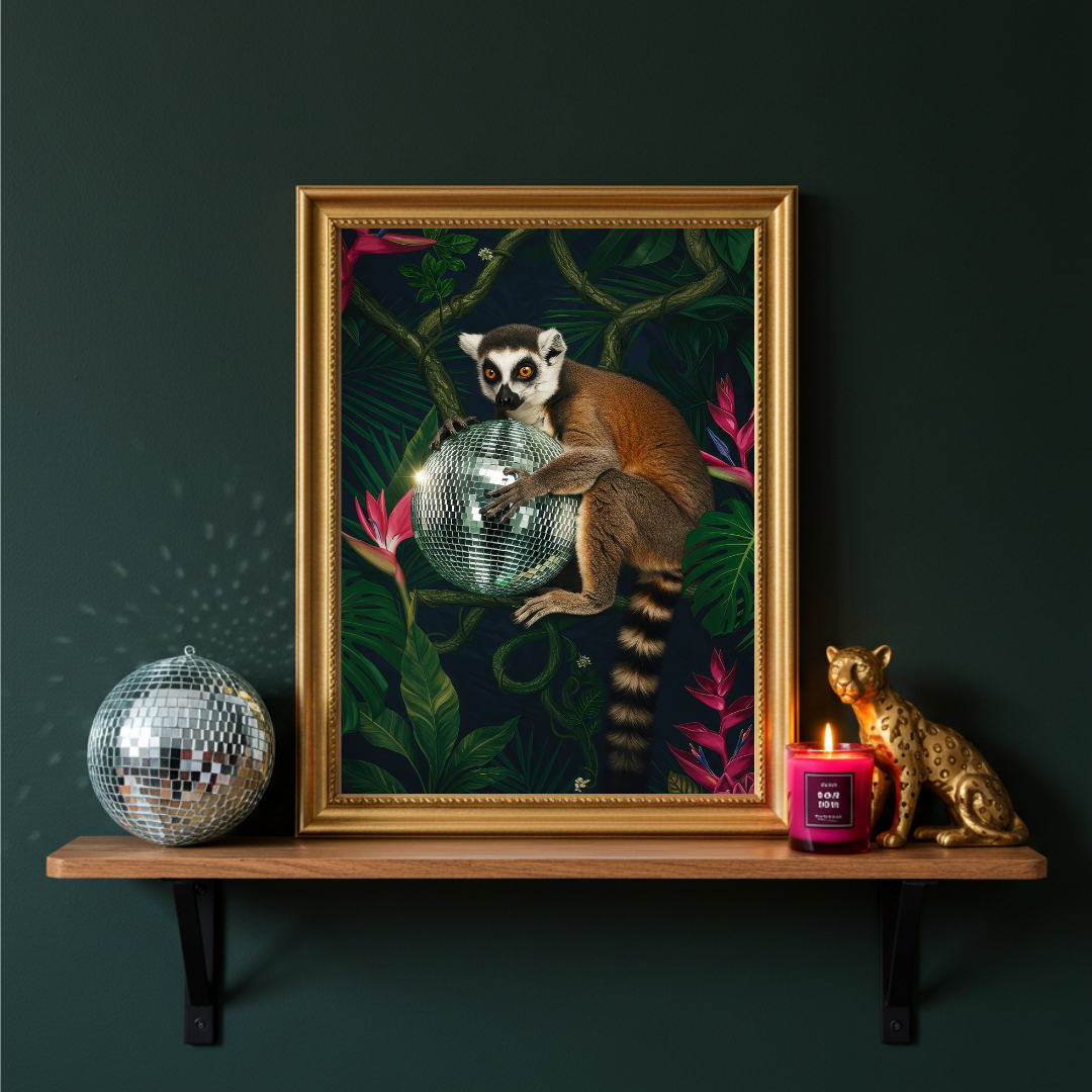 Meet the Lemur Disco Ball – an electrifying fusion of tropical maximalism & quirky glamour. Designed for fearless interior lovers, this print adds instant personality, colour, and a touch of untamed magic to your space.