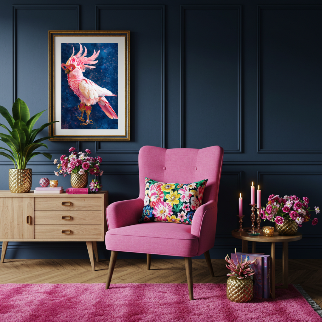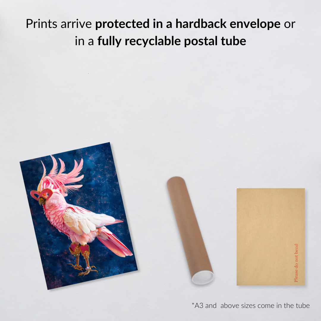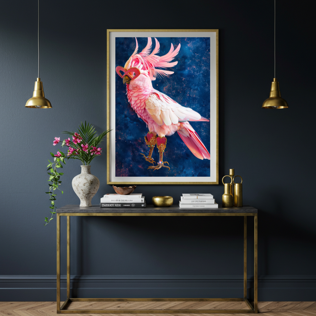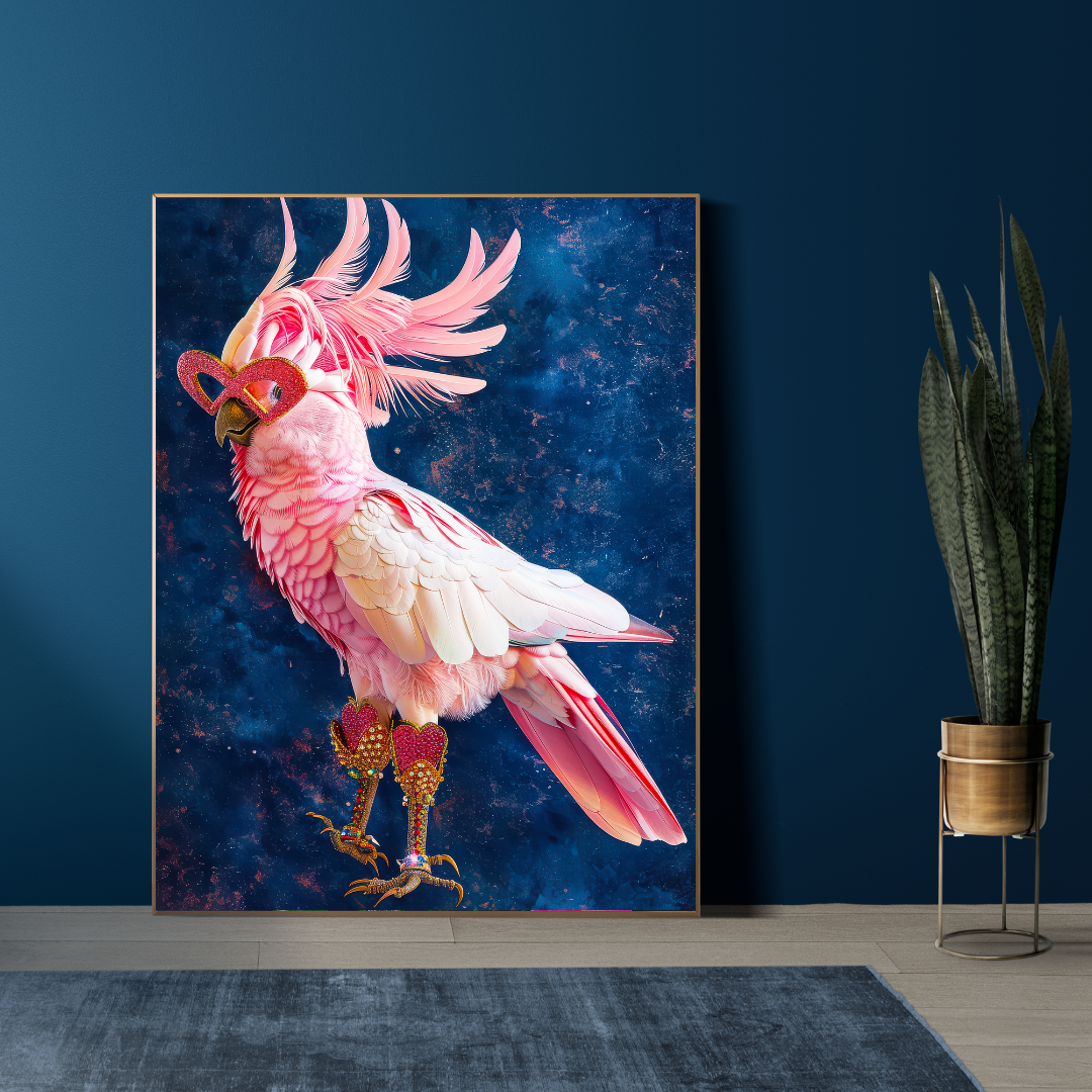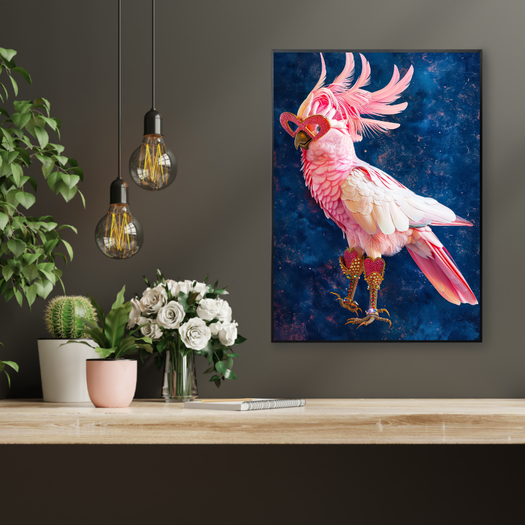 Meet the Pink Cockatoo – a fabulously camp, high-fashion icon perched and preened to perfection. With her heart-shaped sunglasses, glittery gold boots, and fabulous head feathers, she’s not just a bird—she’s the moment. Vibrant, playful, and totally unapologetic, this print is for the bold-hearted and the big-spirited.