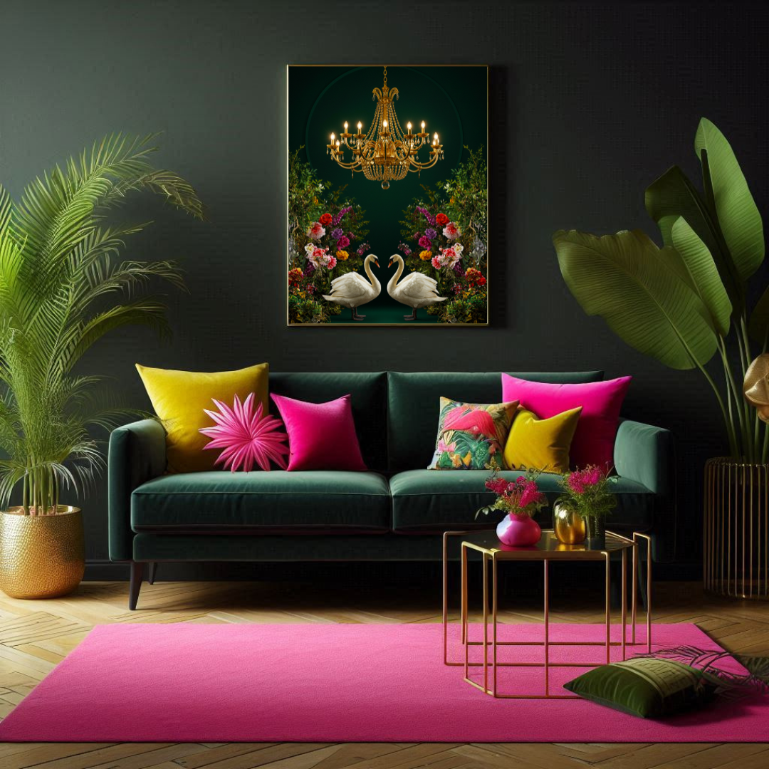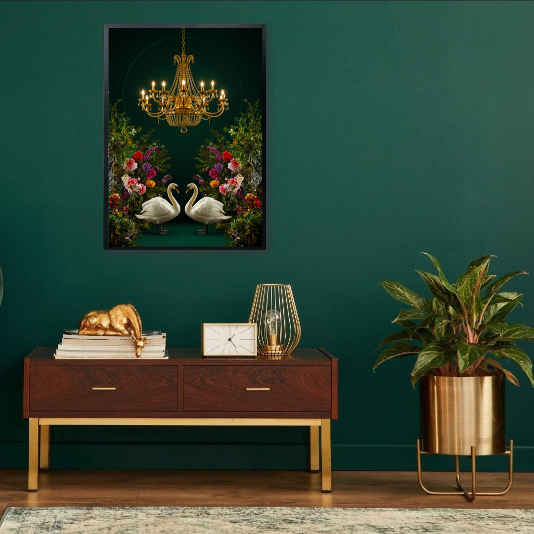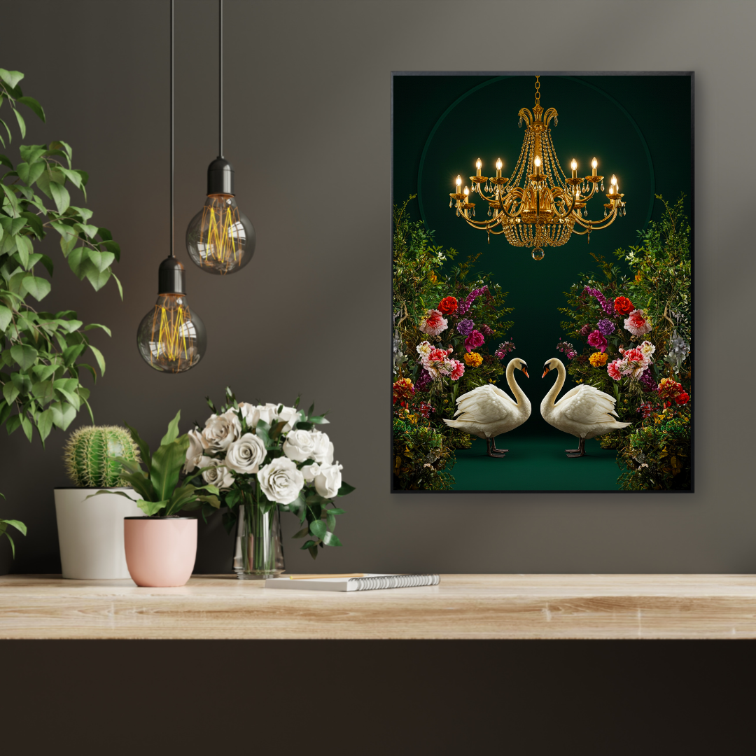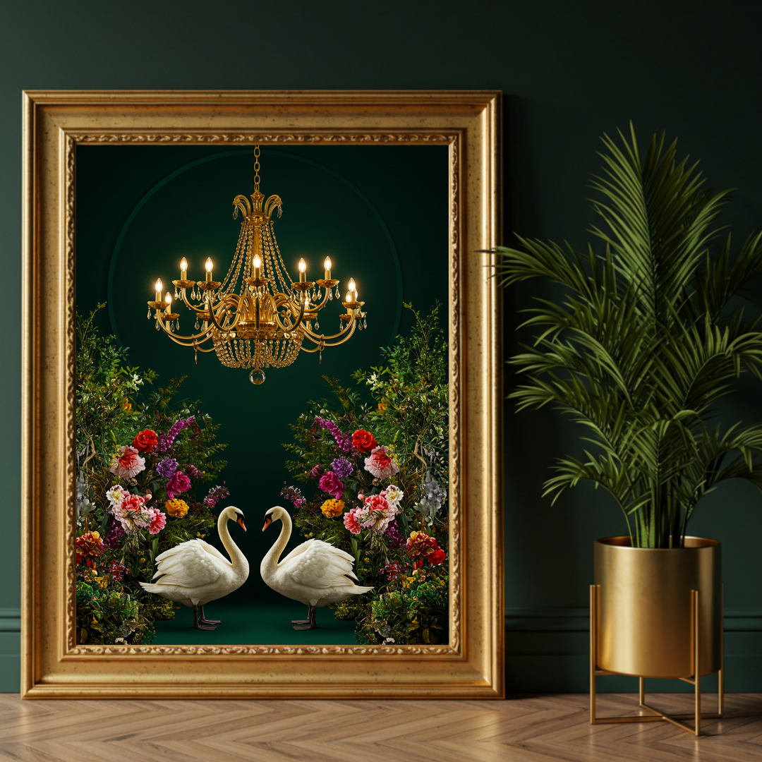 Step into a world of opulent fantasy with this Regal Garden Print. Featuring two elegant swans amidst a rich bed of blooming florals, all illuminated beneath a glowing golden chandelier, this artwork is a statement of luxury, romance, and maximalist flair. Set against a deep emerald backdrop, it oozes vintage glamour and whimsical maximalist beauty.