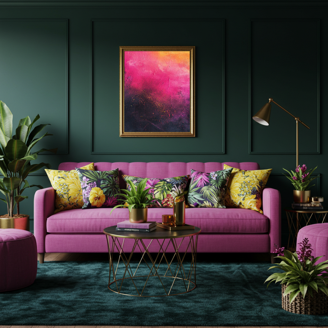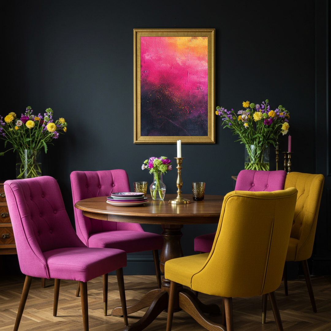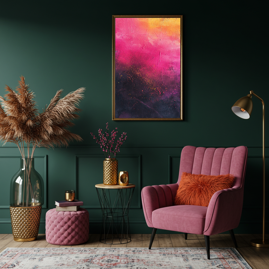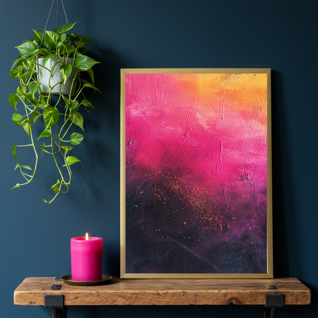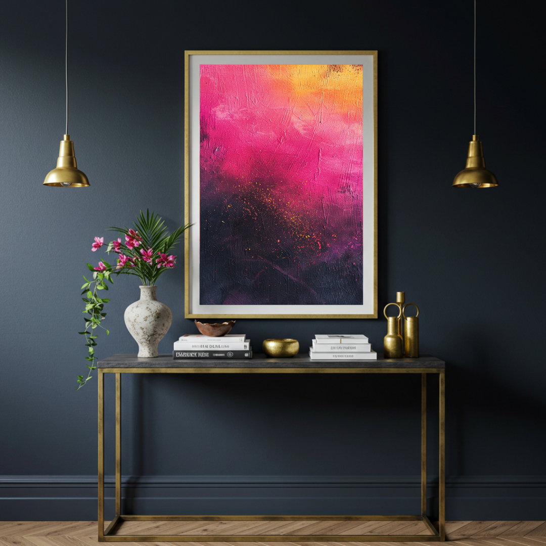 The Sunset Reverie print is a powerful blend of hot pink, deep violet, and molten yellow, layered with textured look brush strokes and cosmic splatters. A bold statement for your walls, it brings mood, depth, and sensuality into your space—perfect for those who crave drama and elegance in equal measure.
